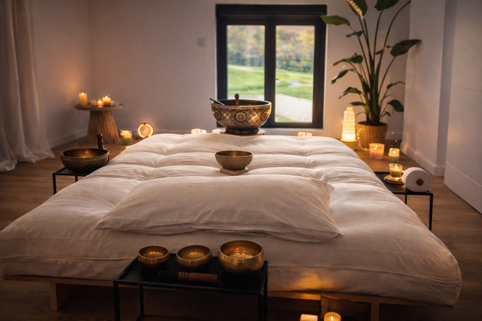 Laissez-vous envelopper par les vibrations apaisantes des bols tibétains, bols cristallins et diapasons thérapeutiques. La sonothérapie est un soin vibratoire d'exception qui agit en profondeur pour dissoudre les tensions, libérer les émotions et restaurer votre équilibre intérieur. Chaque séance est pensée sur mesure, dans un espace de sérénité absolue, pour vous offrir une relaxation profonde et une reconnexion à vous-même.